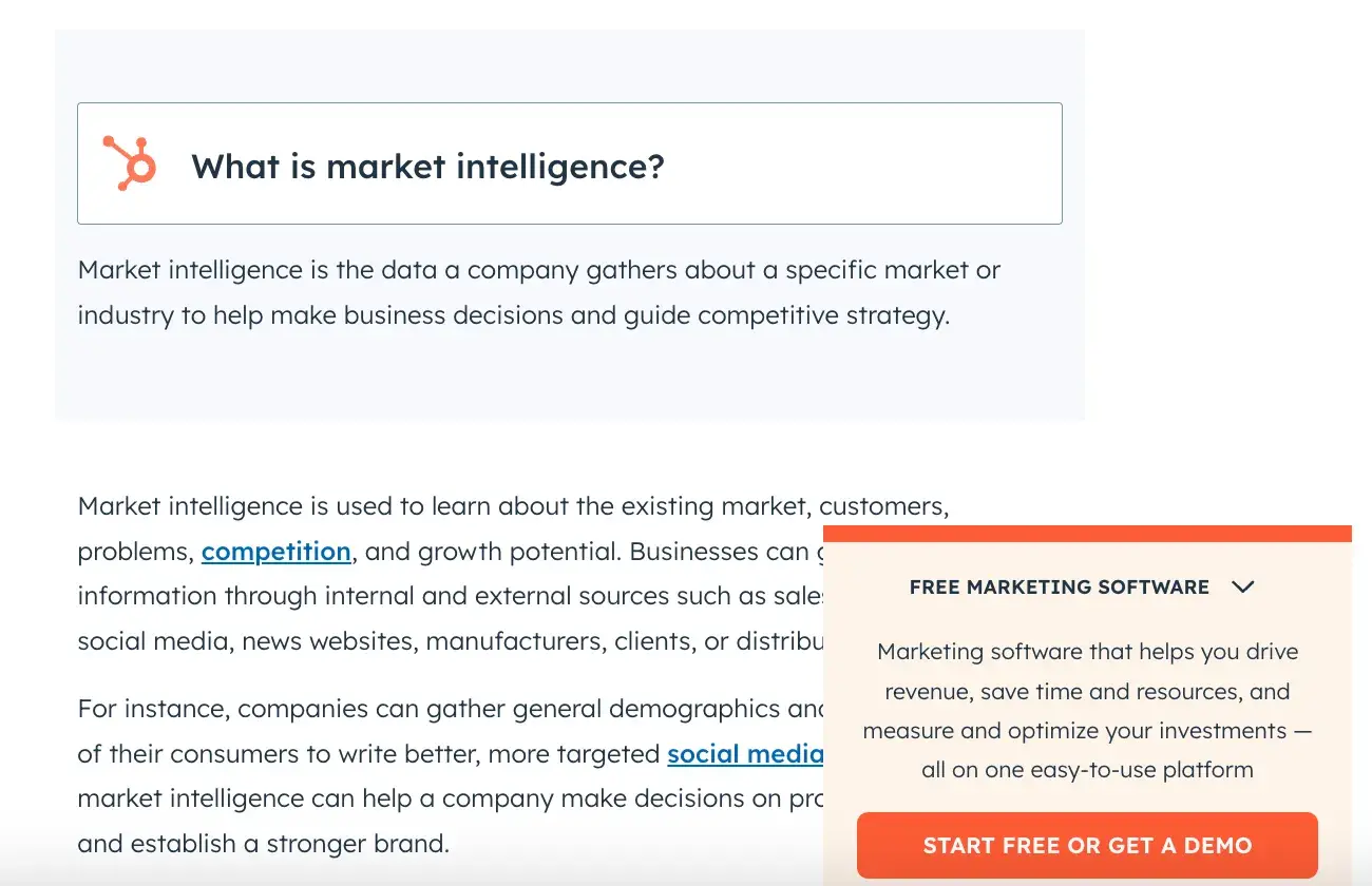 HubSpot masters this area by providing strategic, unobtrusive CTAs that heighten the user experience without disrupting the content flow. As demonstrated, HubSpot’s CTA, positioned in the middle of the article on market intelligence, illustrates how a timely and relevant prompt can enhance value.